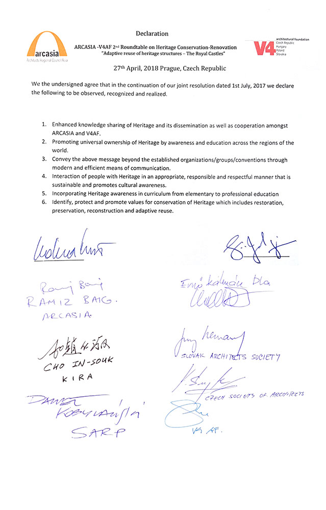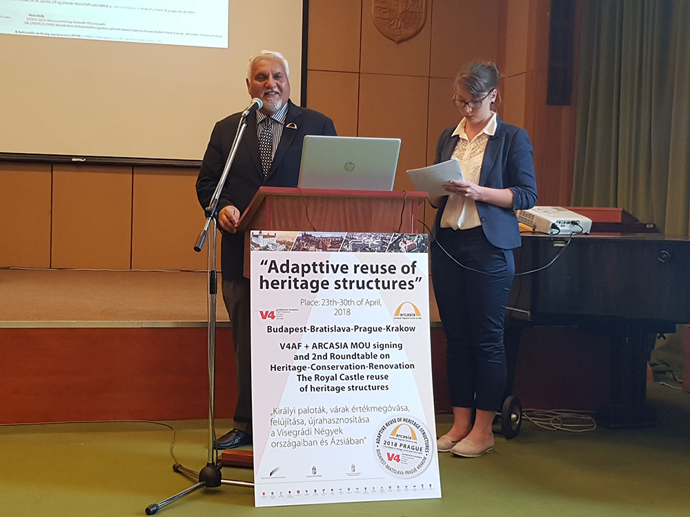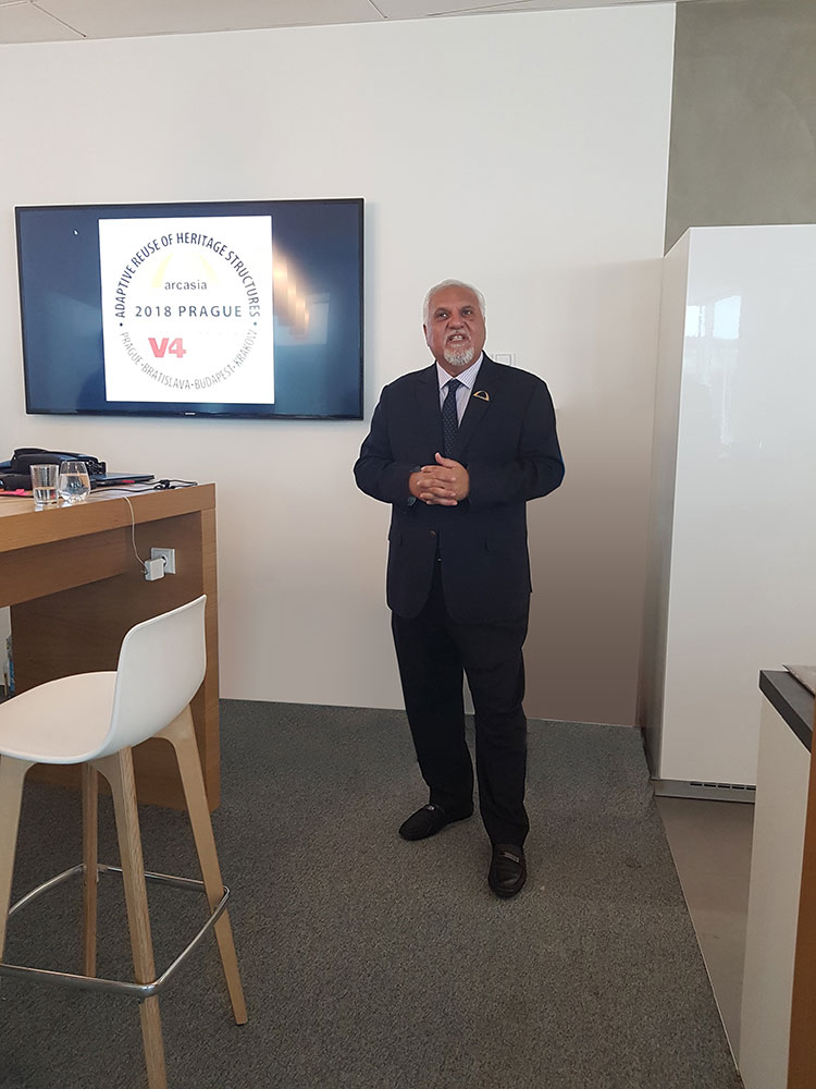 The ARCASIA and V4AF Roundtable on Heritage II “The Royal Castles” was also held in Prague, Czechia. Here specialists from ARCASIA along with specialists from V4AF presented works related to re-adaptive use and restoration work done to castles of their region. From ARCASIA we had presentations by Ar. In Souk Cho (KIRA) ,Ar. Fauzia Qureshi (IAP), Ar. Kavita Jain (IIA) and Ar, Josephine Fu (HKIA) from V4AF we had presentations from. From V4AF there were presentations from Erno Kalman (President V4AF), Ing. Karel Smejkal (Czechia), Pawel Marian Kobylanski (Poland), Peter Fejerdy DLA (Hungary), Jurag Herman (Slovakia) and Csaba Sarkozi (Hungary). The President ARCASIA, Ar. S.M. Jahangir Khan also spoke of how he has promoted cross regional cooperation during his presidency and is happy to see the bonds forming which will surely bear fruit in the coming years. Honorary Secretary ARCASIA, Ar. Ramiz Baig gave a presentation on last year’s successful roundtable leading up to the very recent signing of the MOU between ARCASIA and V4AF.